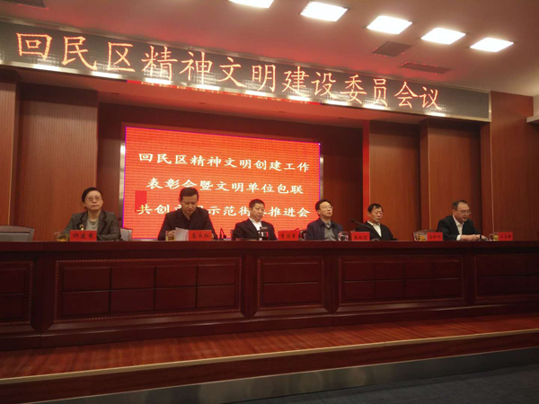 1月19日,回民区精神文明建设委员会在区政府二楼中型会议室召开回民区精神文明创建工作表彰会暨文明单位包联共创文明示范街巷推进会。区委副书记李浩书、区委常委、办公室主任段利滨、区委常委、宣传部部长高永红、区人大副主任马世祥、区政协副主席祁建秀、区委宣传部副部长、文明办主任王志灏出席大会,回民区人社局、住建局、环保局、文体局、卫计局、工商分局、质检分局、食药监局、城执局、环卫局、旅游局、国税局、地税局、园林所、总工会、团委、妇联、科协、残联、红十字会负责人、内蒙古民族商场、呼和浩特市园林管理局、呼和浩特市公安局交管支队机动车驾驶员考试中心等41家各级文明单位负责人、各行政村党(总)支书记、社区包联街巷联系人、文明商户代表参加大会。