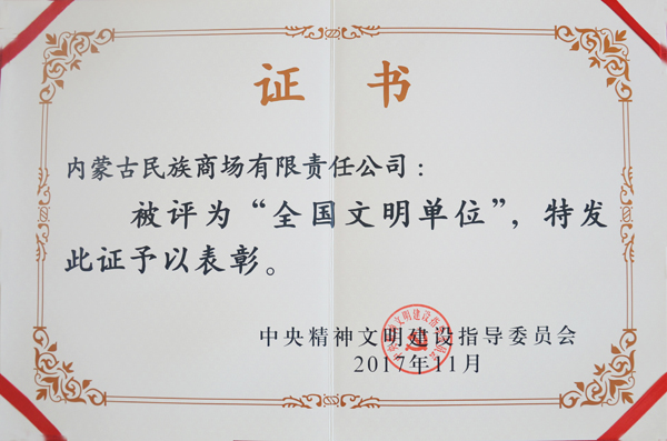 在举国上下全面学习贯彻党的十九大精神之际,内蒙古民族商场有限责任公司在全国精神文明建设表彰大会上被中央文明委授予第五届“全国文明单位”荣誉称号,这是内蒙古民族商场继1985年被授予“自治区文明单位”、1997年被评为“自治区文明单位标兵”之后,又一项精神文明建设工作的丰硕成果,为传承中华老字号增添新的光彩。